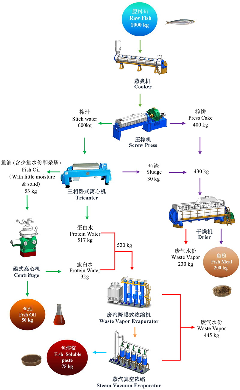 我們可以根據(jù)客戶的投資規(guī)模,工廠選址,環(huán)保要求等條件,為其選擇更好的工藝方案。現(xiàn)以第4種生產線配套方案為例作簡要介紹,同時結合相應的工藝流程圖及物料平衡圖,供客戶參考。物料平衡圖中的數(shù)據(jù),尤其是魚油的得率,會因原料魚種類及其捕獲季節(jié)的不同而有所變化。